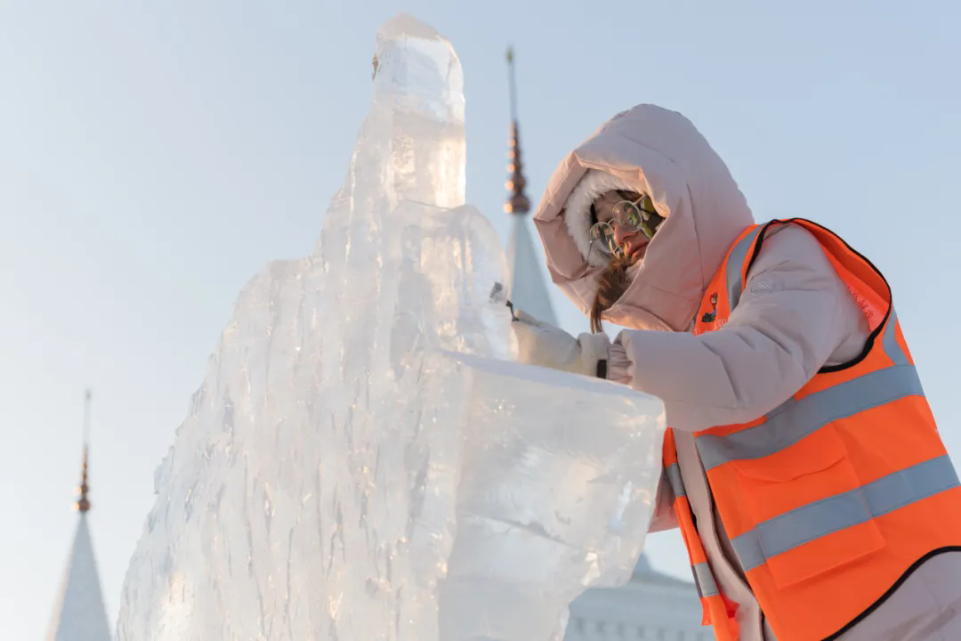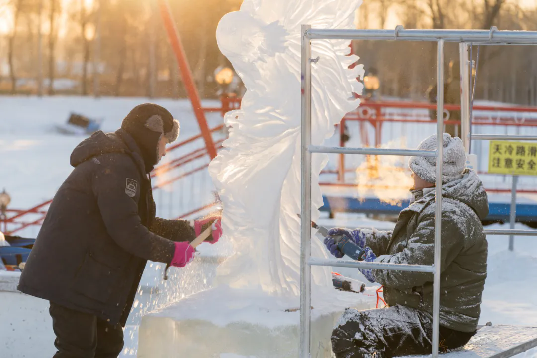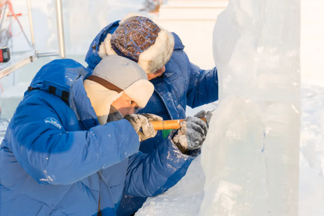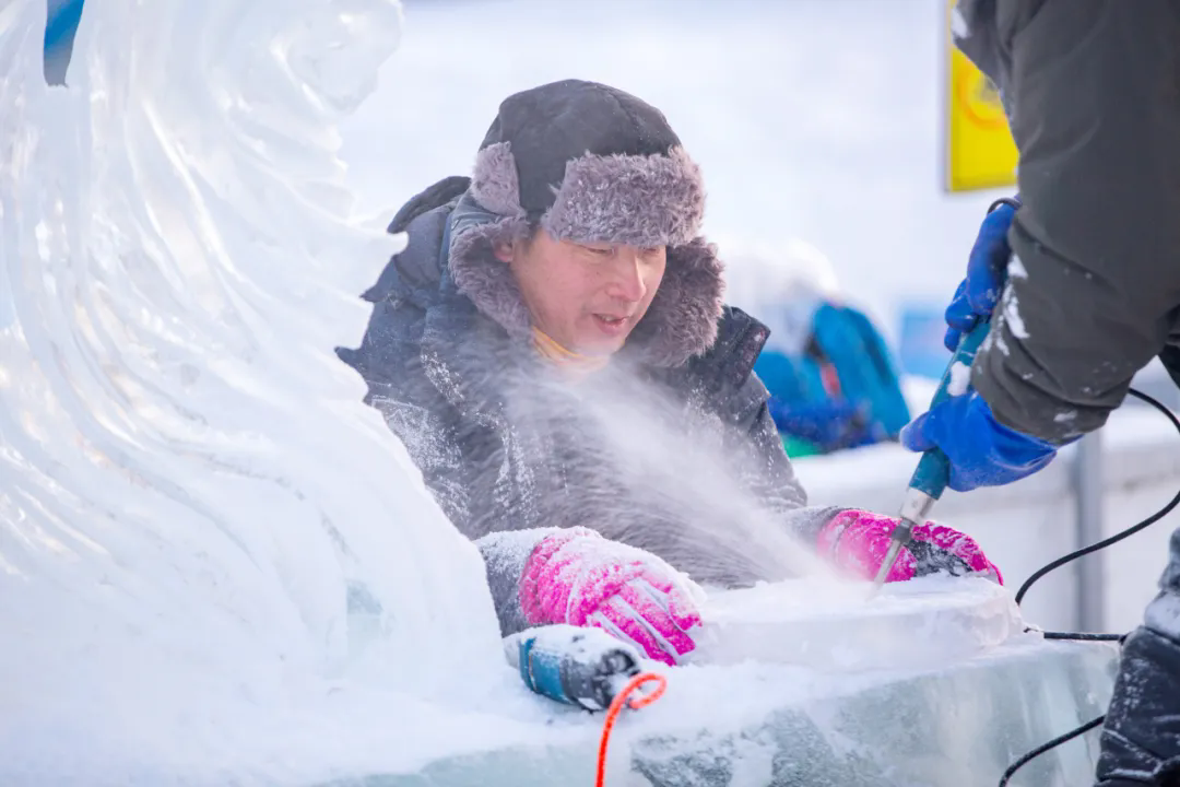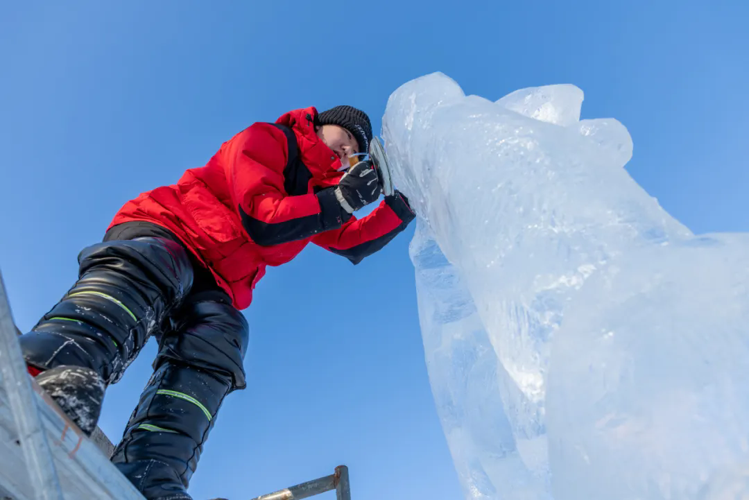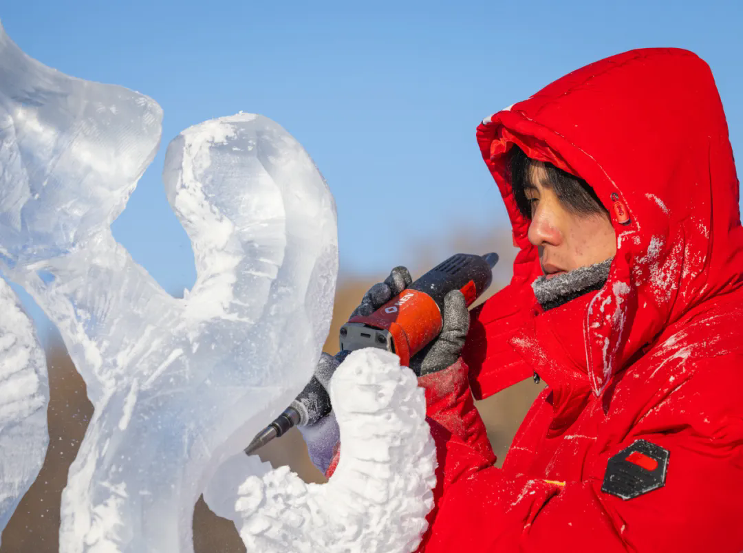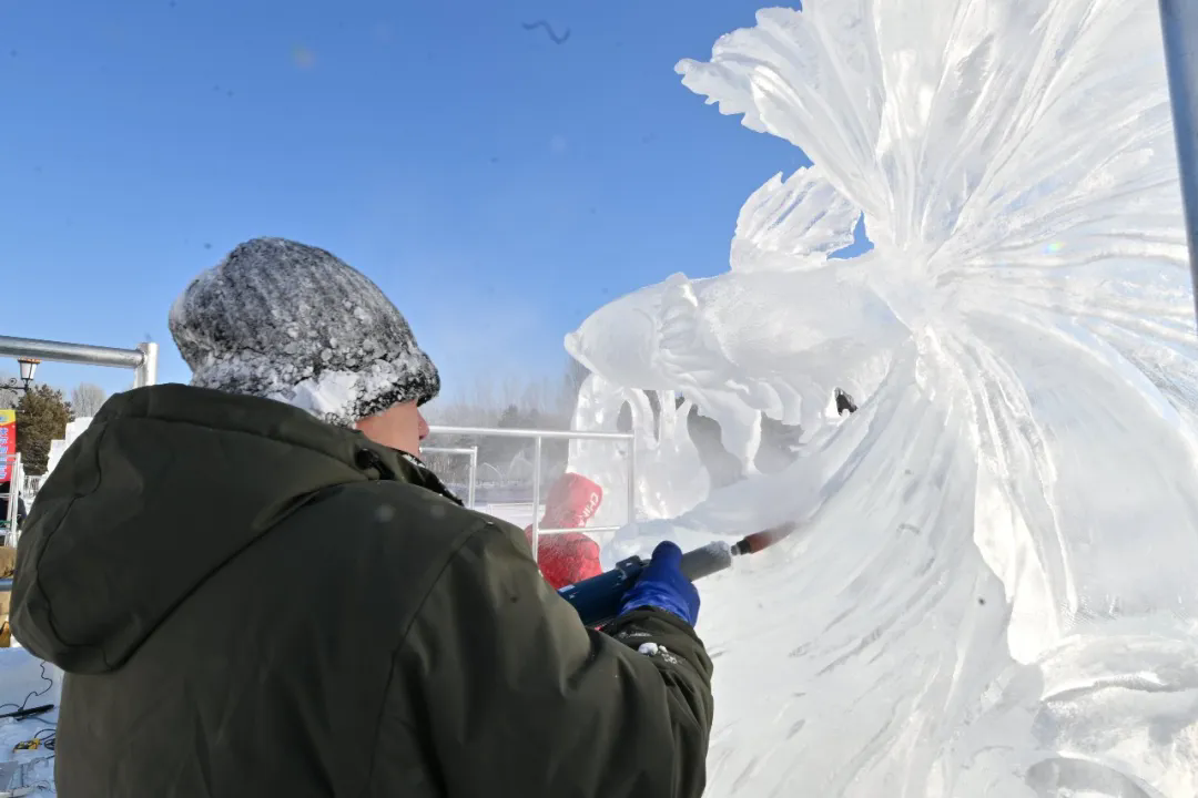 活动现场,高校师生们以冰为材、以刀为笔,匠心雕琢,将一块块晶莹冰料转化为千姿百态的冰雕作品,摄影家们不惧严寒,用镜头多维度记录冰雕制作的全过程。无论是雕刻者专注的神情、冰屑飞舞的瞬间,还是作品逐渐成型的惊艳画面,都被一一定格在影像之中,充分展现了冰雪艺术创作人文匠心与冰雪美学相融共生的鲜活场景。