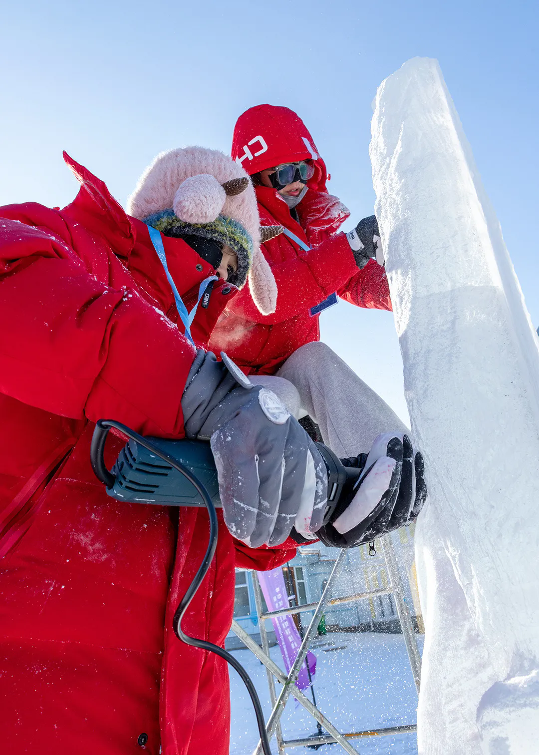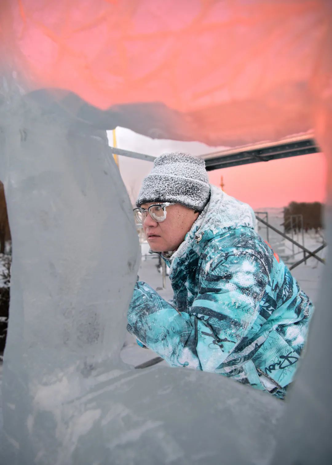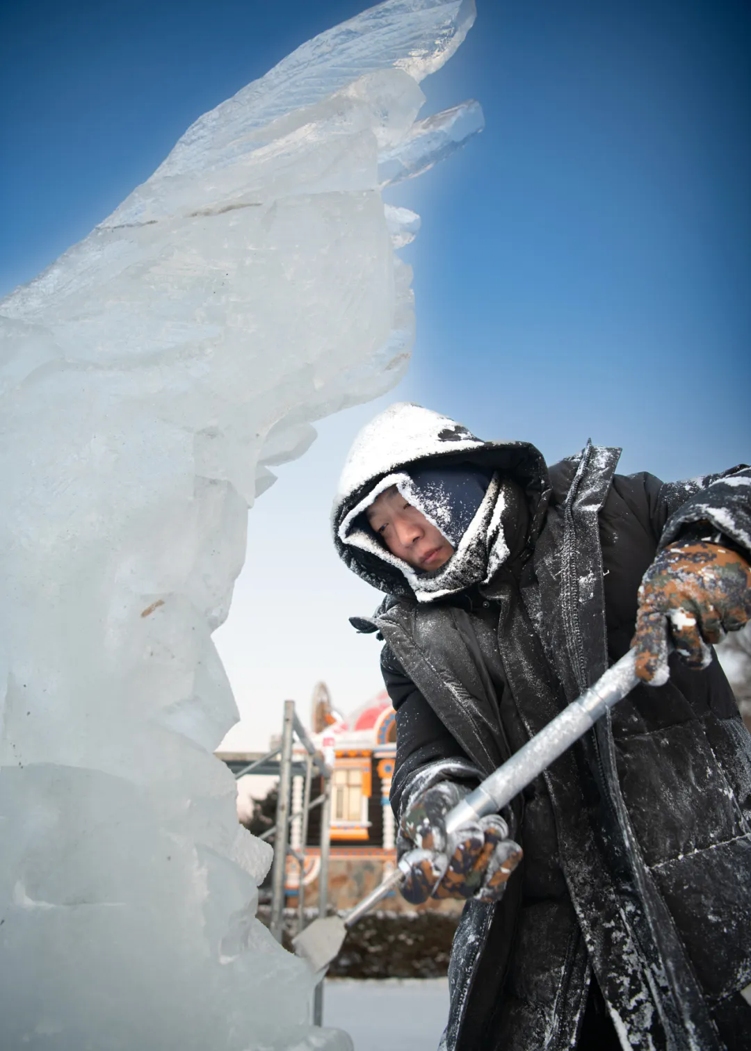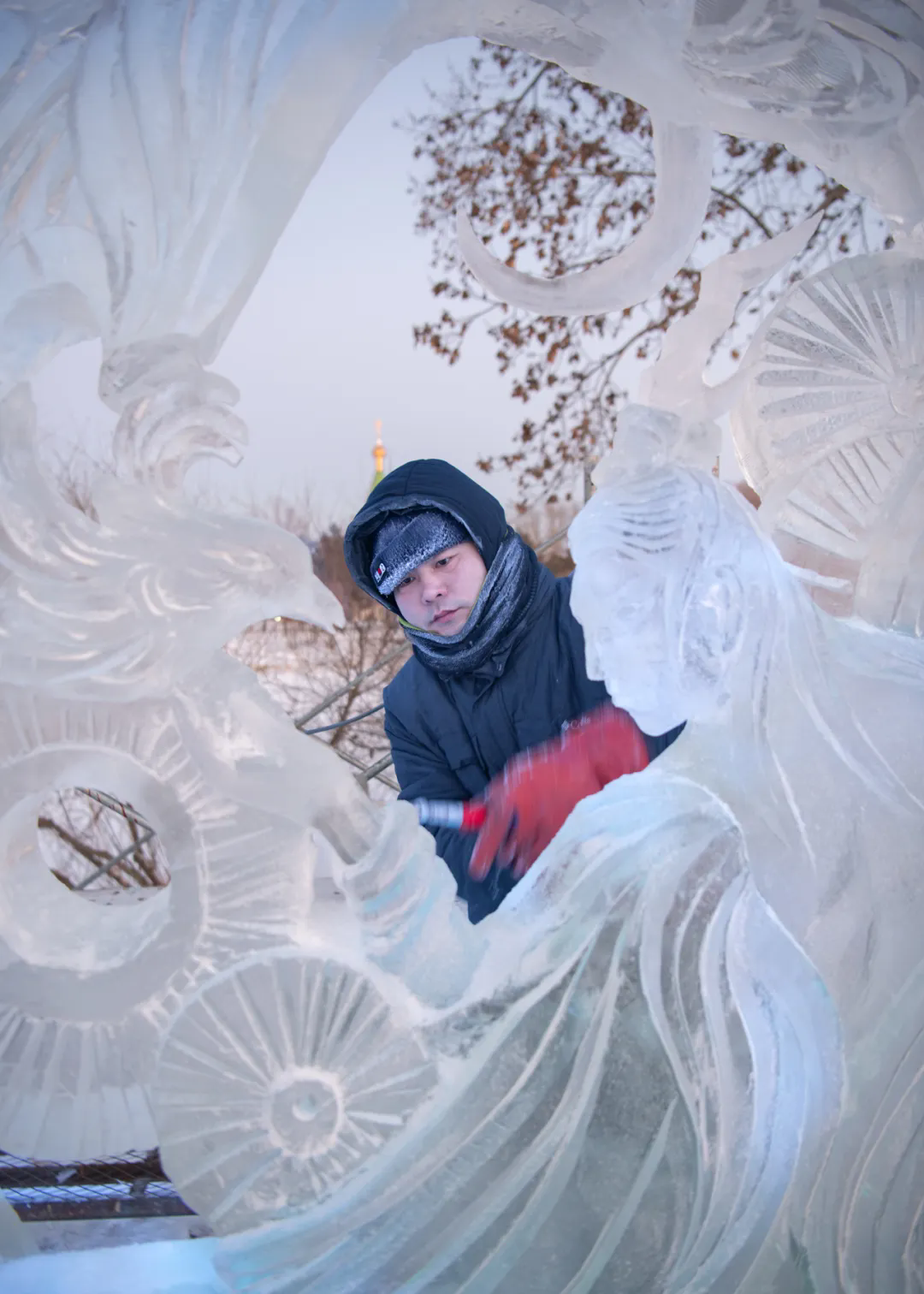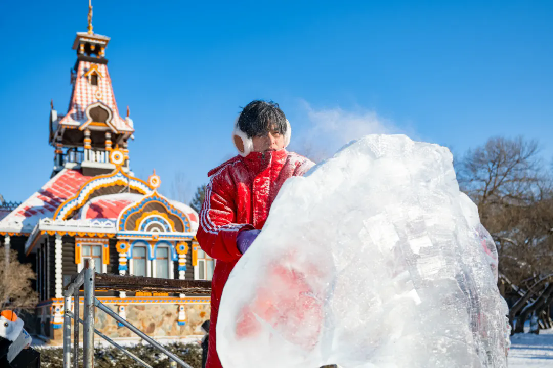 活动现场,高校师生们以冰为材、以刀为笔,匠心雕琢,将一块块晶莹冰料转化为千姿百态的冰雕作品,摄影家们不惧严寒,用镜头多维度记录冰雕制作的全过程。无论是雕刻者专注的神情、冰屑飞舞的瞬间,还是作品逐渐成型的惊艳画面,都被一一定格在影像之中,充分展现了冰雪艺术创作人文匠心与冰雪美学相融共生的鲜活场景。