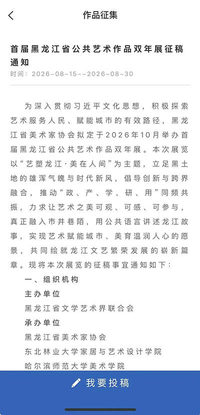 点击首页轮显图“征稿启事 | 首届黑龙江省公共艺术作品双年展”,进入投稿页面。