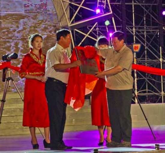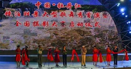 7月8日晚在镜泊湖畔新建的演艺广场,伴随“镜泊胜景”大型多媒体歌舞秀首演,“迷奇火山 秀美镜泊湖”全国摄影大展启动仪式正式拉开了帷幕。牡丹江市市长林宽海宣布启动仪式开幕。中国风景名胜区协会摄影专业委员会主任、著名军旅摄影家宋举浦少将把“镜泊湖摄影基地”的牌匾授予镜泊湖管委会,魏景亮主任接受了牌匾。随后,牡丹江市委副书记沙广华和省摄影家协会主席索久林、《中国摄影》杂志社主编陈仲元、中国摄影家协会副主席、著名摄影家朱宪民,共同为镜泊湖全国摄影大展剪彩。