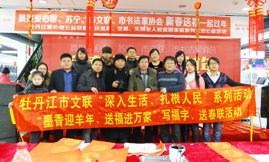 1月24日,在牡丹江市文联副主席禇保军的带队下,牡丹江市书协副主席张东昌、薛庆军、秘书长李丹及协会骨干杨琳、王伟、吴天宝、王尧来到苏宁电器商场,与牡丹江晨报“爱心帮”工作室一起现场为空巢、孤寡、失独及贫困家庭的老人们书写新年的春联和福字,为他们送去新春祝福。拉开了牡丹江市文联“深入生活、扎根人民”系列文艺志愿服务活动―“墨香迎羊年 送福到万家”市书协写福字、送春联活动的序幕。