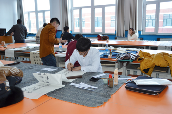 3月10日,在牡丹江市书协副主席、青年书协主席张东昌的带队下,市青年书协成员吴天宝、杨琳、王伟、李伟、刘爽、刘炜星一行7人来到牡丹江市江南经济开发区新建的江南实验学校,为该校题写励志格言类条幅近百幅,极大地丰富了该校的文化建设。