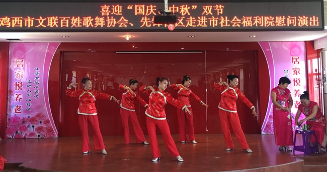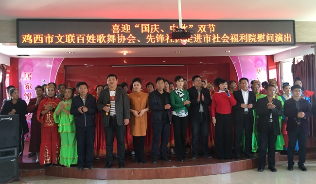 9月30日,在庆祝鸡西建市六十周年、迎庆党的十九大胜利召开之际,由鸡西市文联主办、鸡西市百姓歌舞协会承办的“喜迎国庆中秋月圆”鸡西市文联百姓歌舞协会慰问演出在市社会福利院举办,鸡西市文联、市老龄委、市福利院领导出席了活动,福利院100余名老人观看了演出。