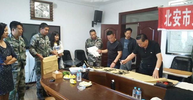 7月27日上午,北安市文联联合市民政局走访慰问了沈阳军区司令部某部队农场,为驻军官兵送去慰问品和节日的问候。由北安市书法家协会会员组成的文艺志愿服务团队挥毫泼墨,为战士创作书法作品80余幅,并现场赠送给战士,赢得了广大官兵的一致好评。
