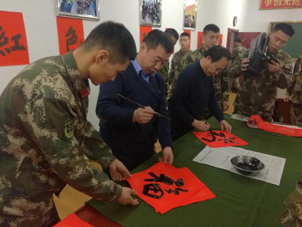 5月23日,尹寿坤一行五人还来到了东山区鹤翔社区和武警支队,现场为社区群众和武警官兵们书写书法作品,送上了一场文化大餐。下一步市书法家协会还将定期深入到厂矿、农村等基层单位,把书法艺术送到千家万户。