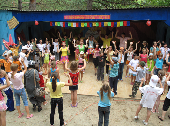 7日一早,代表团来到了有着45年历史的俄罗斯“穆欣基地夏令营”,这是阿穆尔州几大夏令营之一。每到寒暑假,阿穆尔州的孩子都会被家长送到这里,学习独立生活、劳动、交朋友。参加与文化体育有关的游戏和培训。该夏令营的口号是“火种”,含有“曙光”的意思,恰好符合这次“2009中俄青少年文化艺术交流活动”的主题——让我们永远像太阳一样。