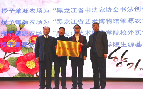 受省书法家协会主席张戈先生委托,全国人大代表、省书法家协会副主席、省工商联副主席陆标,省书法家协会副主席、北大荒书法家协会主席蒋本东共同为肇源农场颁发“黑龙江省书法家协会书法创作基地”牌匾,肇源农场党委书记倪金珠、场长杨广明接受授牌。另外还有农垦绥化管理局党委、农垦绥化管理局党委委员、宣传部长杨再胜、农垦绥化管理局广播电视局局长姜晶等领导和嘉宾一起见证了庄严的时刻。