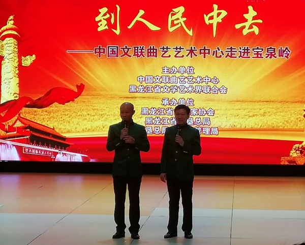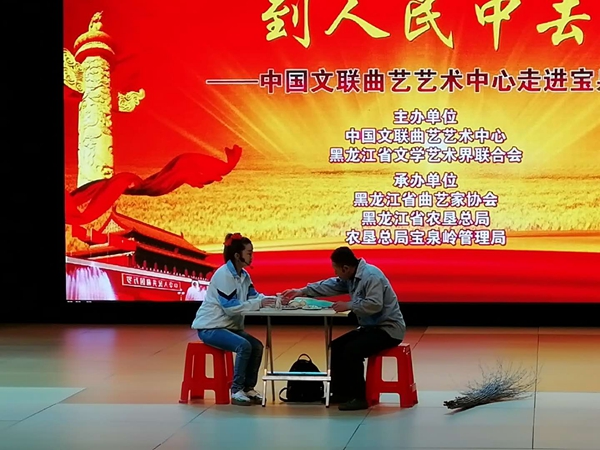 为了回馈当地人民群众,由专家和优秀学员共同准备了一场精彩的演出,《新时代•新思想•新征程 到人民中去》惠民晚会于8日晚6:30在宝泉岭艺体馆举办。晚会邀请了中央电视台教育频道主持人孙朴乔担当主持,共演出十个节目,有快板、相声、情景剧等,给观众带来阵阵笑声,在为艺术家们精湛的表演喝彩的同时,也让群众感受到了曲艺艺术的魅力所在。
