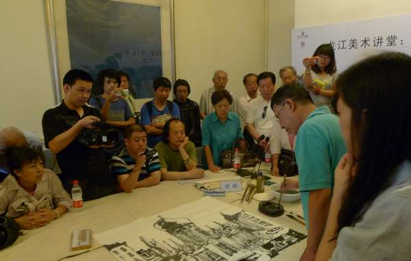 在展览期间,龙江美术讲堂特邀请樊枫先生在黑龙江省美术馆为大家做主题为“都市与水墨”公益讲座,并现场示范。