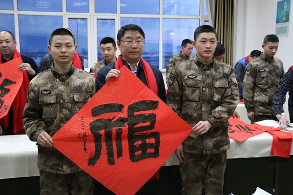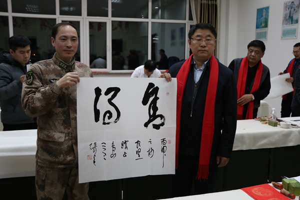 笔会期间,书法家们通过书法与战士们互动交流,将党和政府最美好、最关心、最恳切的祝福送到了战士们的心头。一名刚入伍四个月的新兵在书法家的指导下,为自己的连队写起了春联。现场战士们纷纷拿着书家的作品与作者合影,红彤彤的脸蛋映着红彤彤的福字,吉祥年味在边防哨所提前到来。