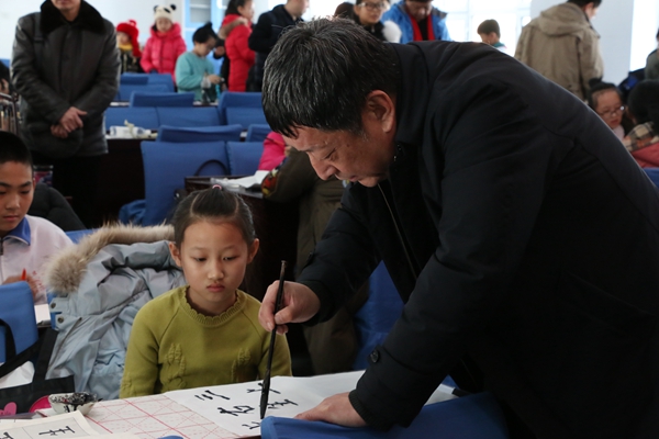 课堂系统讲解后,书法家们细心耐心的与孩子们进行一对一的书法指导,幽默的话语不仅让孩子们的脸上扬起开心的笑容,也将整个活动的氛围推上了高潮。