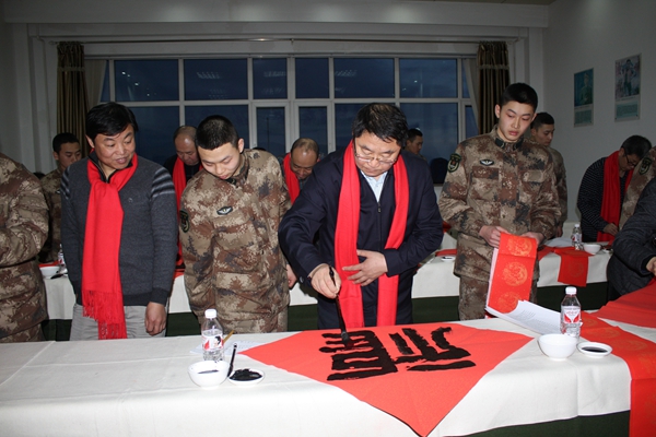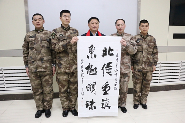 1月19日,由张戈主席带队,书法家慰问团一行来到中国东极黑瞎子岛,为驻岛官兵送上新春祝福。驻岛官兵向前来慰问的书法家们自豪地介绍说,习近平总书记曾于去年登岛慰问官兵,大家深感自豪,倍受鼓舞!