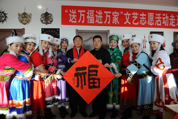 根据《中国文联关于开展“文艺扶贫奔小康”志愿服务行动的通知》,响应中国书协“万名书法家送万‘福’进万家”公益活动的号召,通过书法工作者“深入生活、扎根人民”,送“福”字、写春联、进万家这一系列活动的形式,引导更多的书法工作者牢固树立“艺术为人民”的创作导向,营造和谐温馨、祥和向上的春节氛围,两节以来,由中国书协、黑龙江省文联、黑龙江省书协、哈尔滨电视台《增值空间》栏目共同主办的“送万福进万家”文艺志愿服务走进黑瞎子岛系列活动正式启幕。