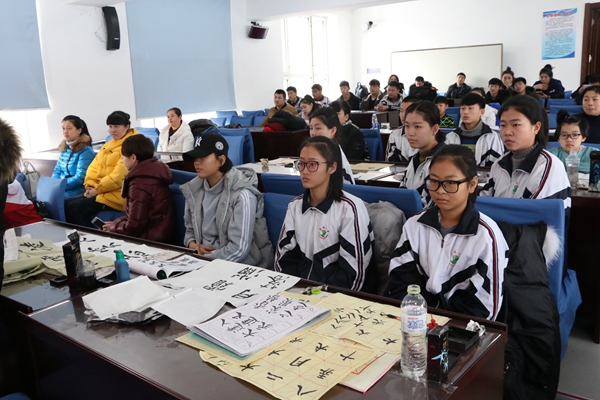中国书协理事、省书协驻会副主席兼秘书长胡志平在致辞表示,“龙江书法大讲堂”是省书协为广泛开展“深入生活•扎根人民”主题实践活动而着力打造的公益性文化惠民项目,致力于书法艺术的社会化、大众化传播。现在,它已经成为省书协惠民文化的品牌项目。抚远市教育体育局书记尚雪辉代表全体师生感谢中国书协、黑龙江省文联、省书协来到抚远第一中学指导教学,并期望以后能够多开展此类书法交流的活动。省书协理事、省书法活动中心副主任石正军从书法和书法家、书法的历史、如何赏析书法等方面阐述了书法的魅力。此次活动由抚远市文联主席赵咏娟主持。