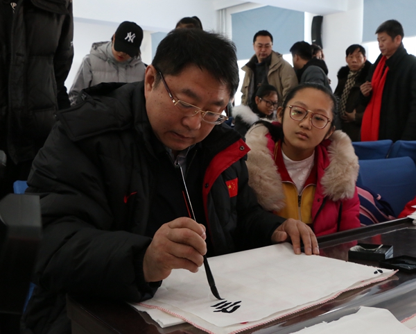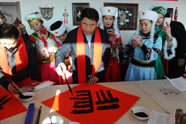 仪式后,书法家们挥毫运笔,为少数民族朋友们书写了一幅又一幅满载憧憬与祝福的春联、福字,场面十分热烈。一位村民说:“以前我们都不懂书法,总觉得在市集上买上一副春联也能对付。可是经过这一次活动,才让我深深的受到了震撼,感受了书法的魅力,我以后一定会让我家孩子去学习书法,感谢各位书法家。”当地一位吉普色老人表示,感谢书法家把大红福字、春联送到家门口,也让我们记住了这难忘的一天。她还用赫哲语为全国人民送上赫哲族人民的节日祝福。