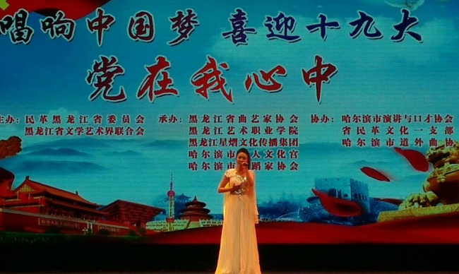 喜迎十九大•唱响中国梦—党在我心中 大型综艺演出于2017年10月10日下午3:00时在哈尔滨市工人文化宫成功举办。此次活动由民革黑龙江省委、黑龙江省文学艺术界联合会共同主办;黑龙江省曲艺家协会、黑龙江艺术职业学院、黑龙江星熠文化传播集团、哈尔滨市工人文化宫和哈尔滨市舞蹈家协会承办;哈尔滨市口才演讲协会、省民革文化一支部和哈尔滨市道外区曲协协办。