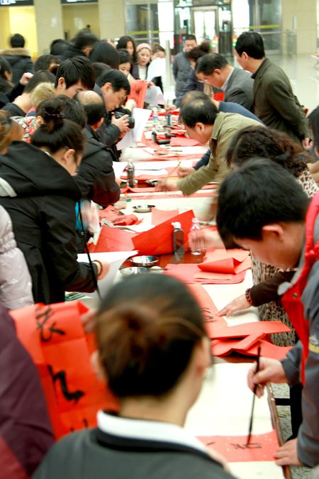 2014年1月24日上午,纷纷扬扬的小雪不期而至。此刻,在哈尔滨西站的候车大厅内喜气洋洋,春意浓浓:来自黑龙江省文联和哈尔滨市铁路局的书法家现场挥毫泼墨,书写春联,给过往的旅客送上新春的祝福。
