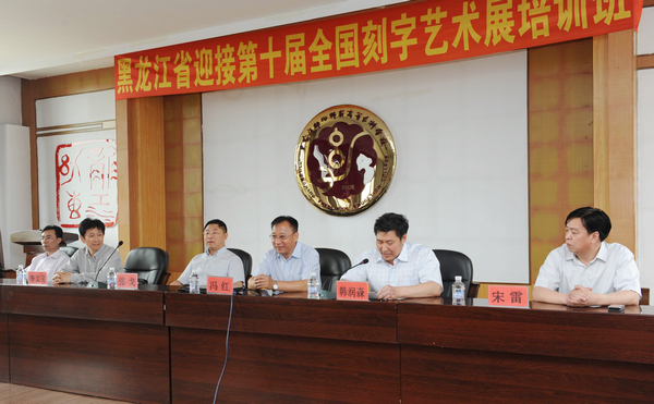 为迎接“全国第十届刻字艺术展”,提高黑龙江省的刻字创作水平,6月6日至8日,由黑龙江省书协、牡丹江市书协、黑龙江省书协刻字艺术委员会承办的迎接全国第十届刻字艺术展培训班在牡丹江市开班。省文联党组成员、副主席、省书协常务副主席张戈,牡丹江市文联主席冯红、副主席褚保军,牡丹江市书协主席韩润森以及来自全省各地的书刻学员60余人参加了开班仪式。