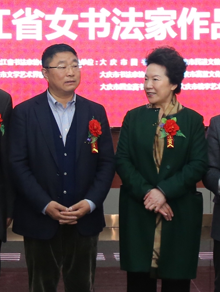 省文联党组成员、副主席、中国书协理事、省书协常务副主席兼秘书长张戈,大庆市政协副主席于智玲,省书协副主席、副秘书长胡志平,省书协副主席魏锁亭,省书法活动中心副主任王斌,大庆市文联党组书记王璟,大庆市文联主席柳庄,大庆市书协主席伊文琦,省书协展览部主任秦嘉彬,省书协办公室主任、省妇女书协秘书长王晓凤,省书协组联部副主任赵莹,省书协资料室主任王晓彦,省书协组联部干部周亮,哈师大美术学院书法篆刻教研室主任、硕士研究生导师芦海娇,省妇女书协副主席杨宗英,黑河市妇女书协主席毛丽娟,大庆市炼化公司美术设计工程师王卉,大庆市科泽印刷有限公司总经理刘淑媛等各界人士及女作者百余人出席开幕式。