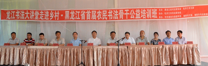 为迎接十九大胜利召开,贯彻落实习近平总书记在文艺工作座谈会和中国文联十次文代会上的重要讲话精神,深入基层,扎根人民,让传统文化走进农村,促进书法艺术的大众化普及和传播,由黑龙江省书协、牡丹江市文联主办,牡丹江市书协协办,中共海林市委宣传部、海林市文联、海林市书协承办的“龙江书法大讲堂走进乡村•黑龙江省首届农民书法骨干公益培训班”于2017年7月25日在海林市举办。