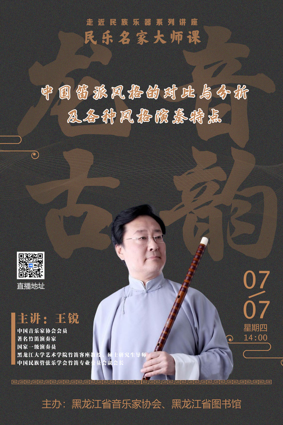 7月7日14时,由黑龙江省音乐家协会、黑龙江省图书馆主办的“文联大讲堂”之龙音古韵——走近民族乐器系列讲座(第41期)民乐名家大师课《中国笛派风格的对比与分析及各种风格演奏特点》由王锐教授担任主讲,以腾讯会议线上直播的方式播出。