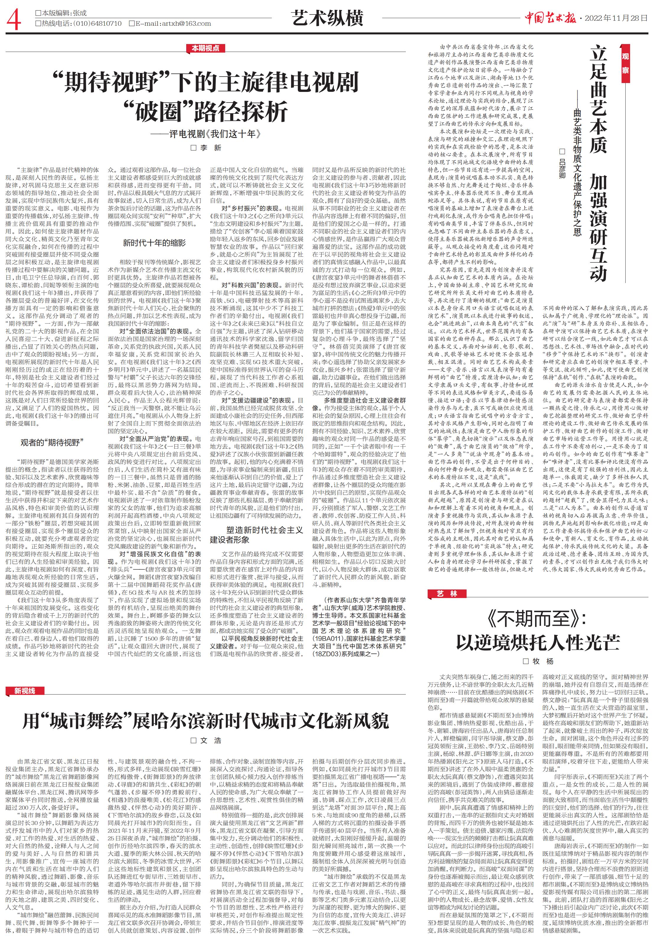 “城市舞绘”黑龙江省舞蹈影像网络展演于10月2日直播放送,受到观众和网友的热情欢迎和广泛好评。11月28日,中国艺术报在艺术纵横版面新视线栏目刊发文章予以报道。