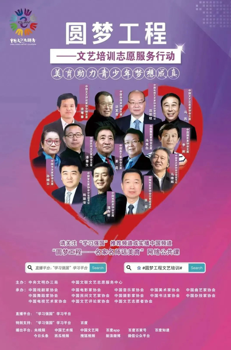 自2018年开始,开展由中央文明办三局和中国文联文艺志愿服务中心共同实施的“圆梦工程”文艺培训志愿服务行动。2022年5月18日至7月2日,“圆梦工程”文艺培训志愿服务行动“名家名师话美育”网络公共课开讲。13个全国各文艺家协会主席和艺术家在线讲授美育公开课。今年的课程以各艺术门类在文化强国建设中发挥的重要作用为主题,通过网络直播形式面向大众,重点针对乡村学校少年宫艺术辅导员,讲授美育系列公开课,并在“学习强国”学习平台进行系列直播,为普及艺术教育、营造美育氛围做出了积极贡献。