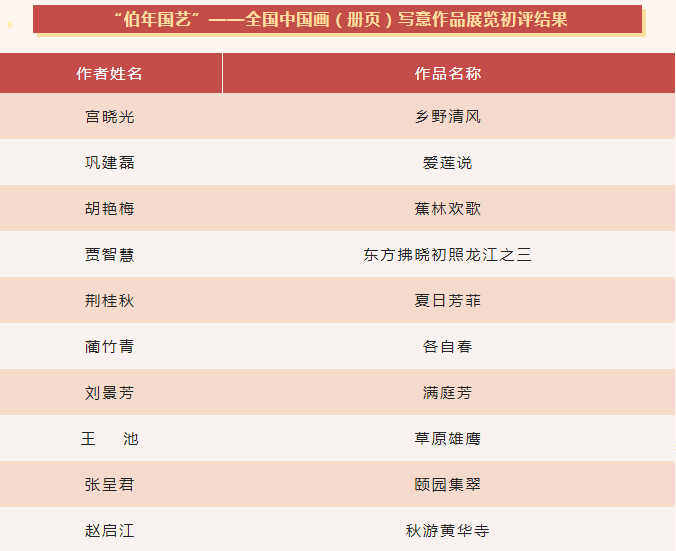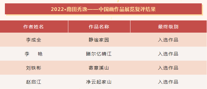近日,由中国美术家协会与中共常州市委宣传部主办的“2022·南田秀逸——中国画作品展览”复评结果公布,我省4位作者复评通过。由中国美术家协会、浙江省文学艺术界联合会、杭州市萧山区人民政府联合主办的“伯年国艺”——全国中国画(册页)写意作品展览初评结果公布,我省10位作者初评通过。