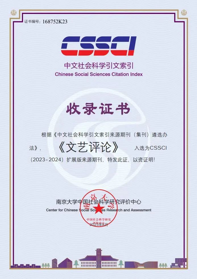 近日,南京大学中国社会科学研究评价中心中文社会科学引文索引(CSSCI)评价结果公布,《文艺评论》入选CSSCI(2023—2024)扩展版来源期刊。
