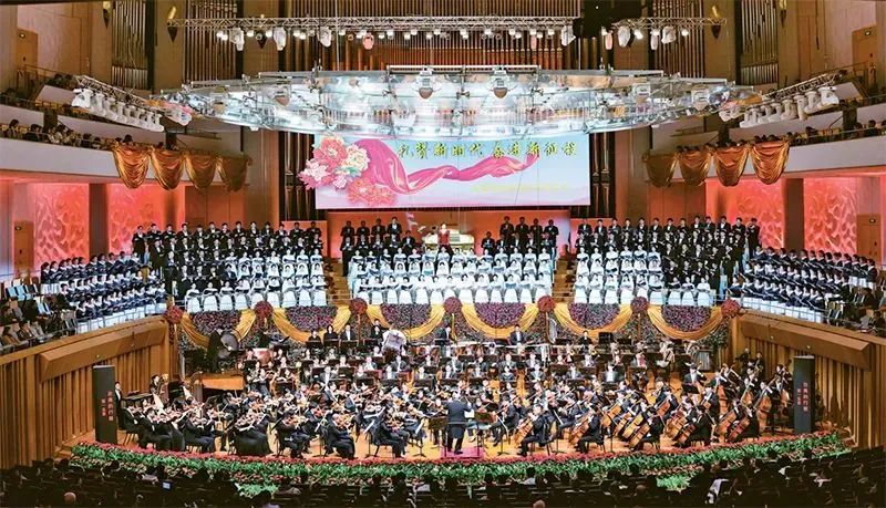 2023年10月9日,由中国文学艺术界联合会、中国音乐家协会共同主办的“礼赞新时代 奋进新征程”大型原创交响作品音乐会在国家大剧院音乐厅上演。图为音乐会现场。