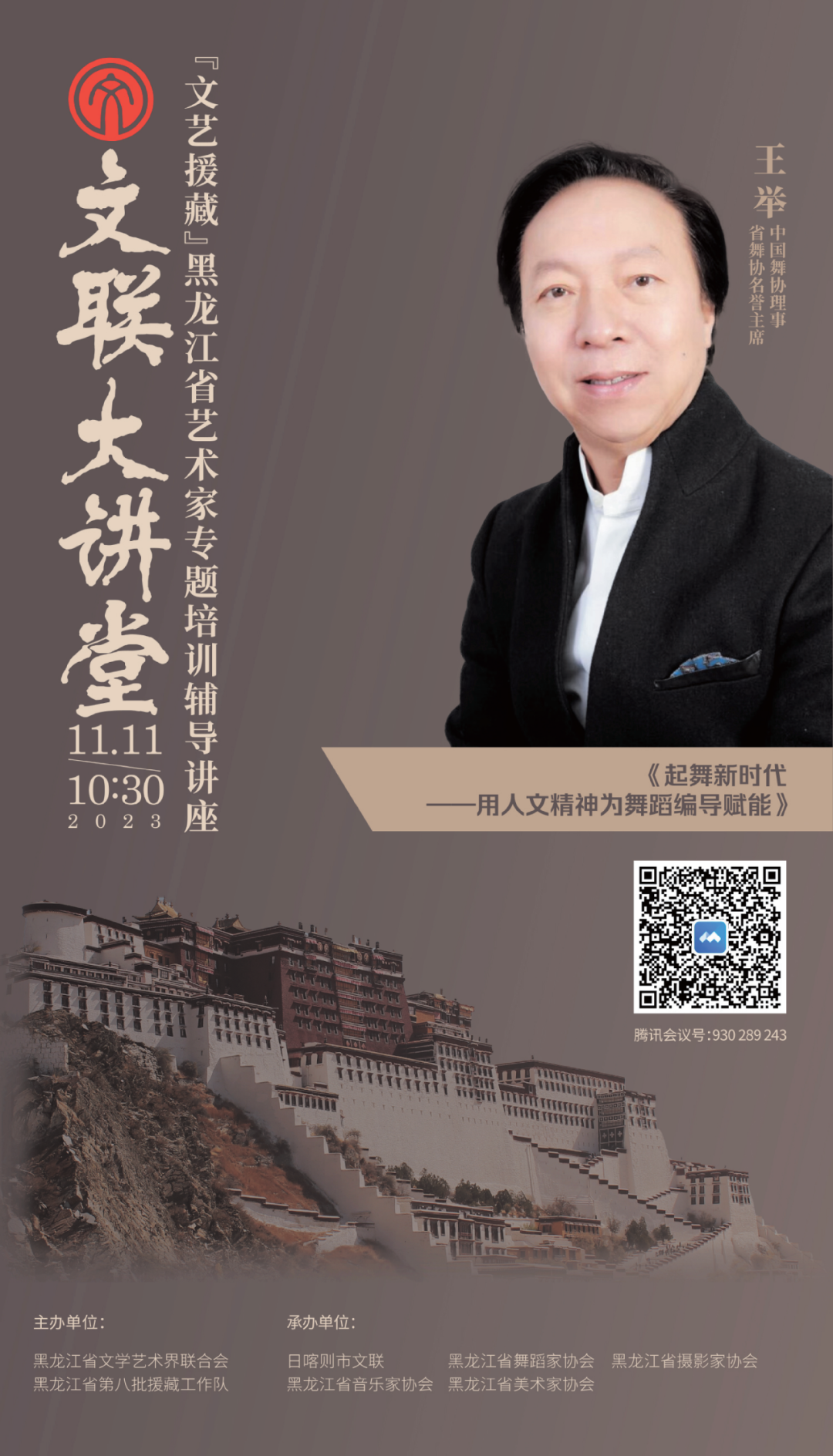 由黑龙江省文学艺术界联合会、黑龙江省第八批援藏工作队主办,日喀则市文联、黑龙江省音乐家协会、黑龙江省舞蹈家协会、黑龙江省美术家协会、黑龙江省摄影家协会承办的“文艺援藏”黑龙江省艺术家专题培训辅导讲座第一期《起舞新时代——用人文精神为舞蹈编导赋能》将于11月11日10时30分在腾讯会议APP线上开讲。