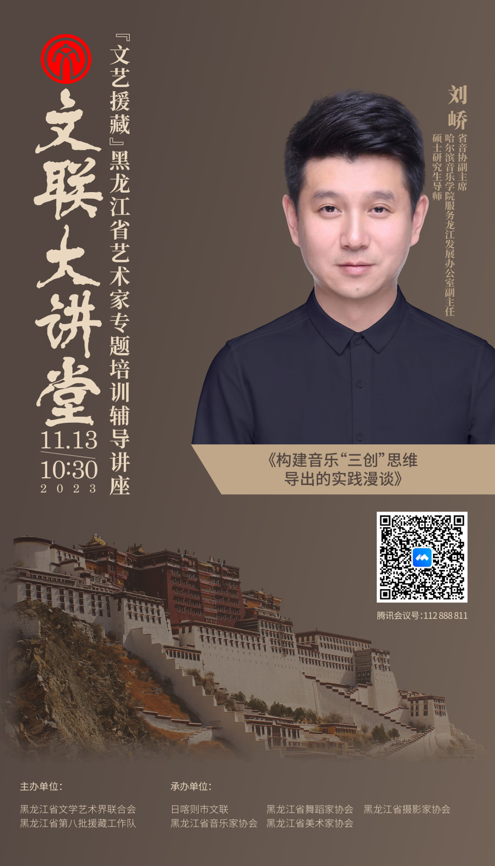 由黑龙江省文学艺术界联合会、黑龙江省第八批援藏工作队主办,日喀则市文联、黑龙江省音乐家协会、黑龙江省舞蹈家协会、黑龙江省美术家协会、黑龙江省摄影家协会承办的“文艺援藏”黑龙江省艺术家专题培训辅导讲座第三期《构建音乐“三创”思维导出的实践漫谈》将于11月13日10时30分在腾讯会议APP线上开讲。