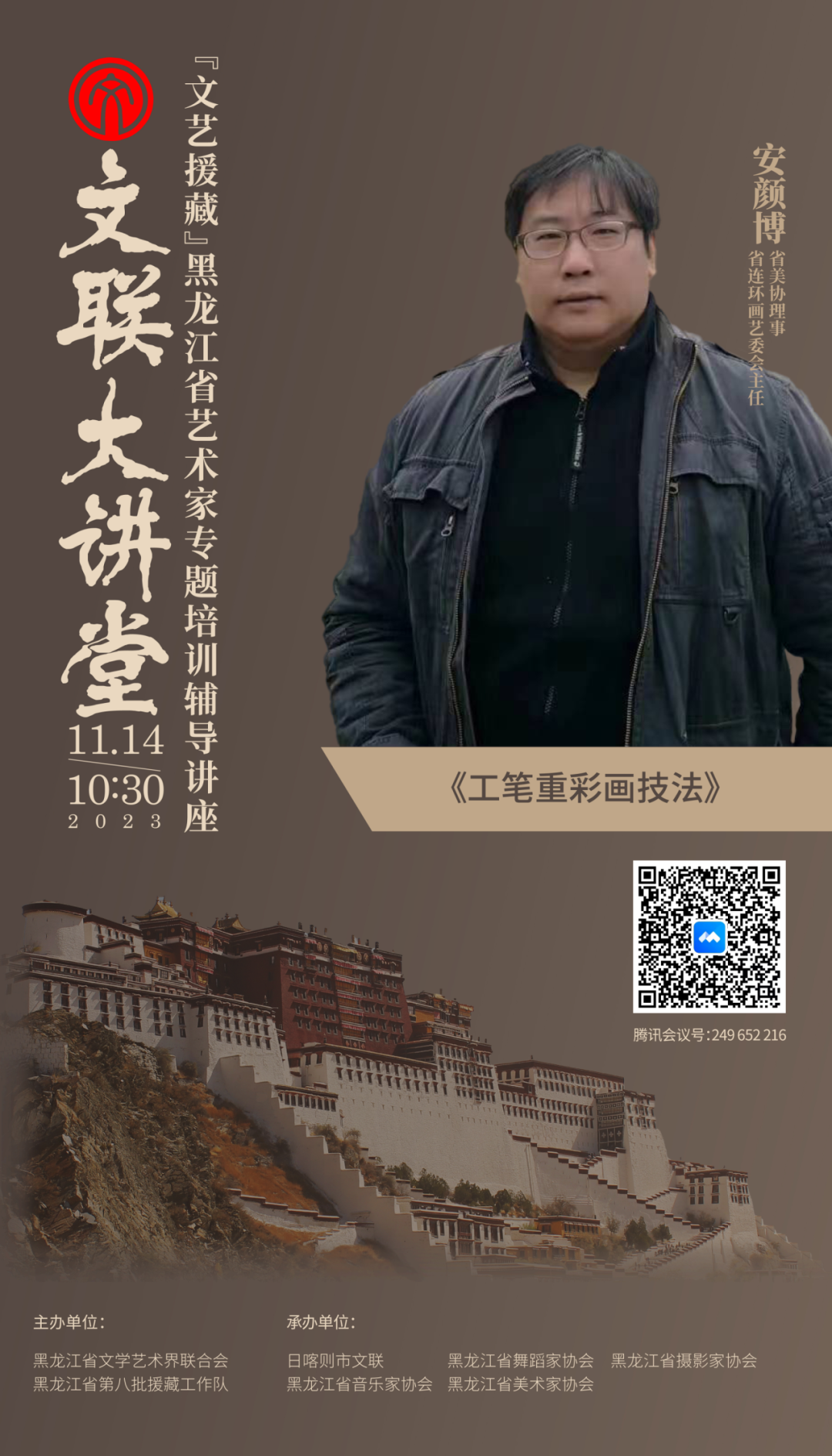 由黑龙江省文学艺术界联合会、黑龙江省第八批援藏工作队主办,日喀则市文联、黑龙江省音乐家协会、黑龙江省舞蹈家协会、黑龙江省美术家协会、黑龙江省摄影家协会承办的“文艺援藏”黑龙江省艺术家专题培训辅导讲座第四期《工笔重彩画技法》将于11月14日10时30分在腾讯会议APP线上开讲。
