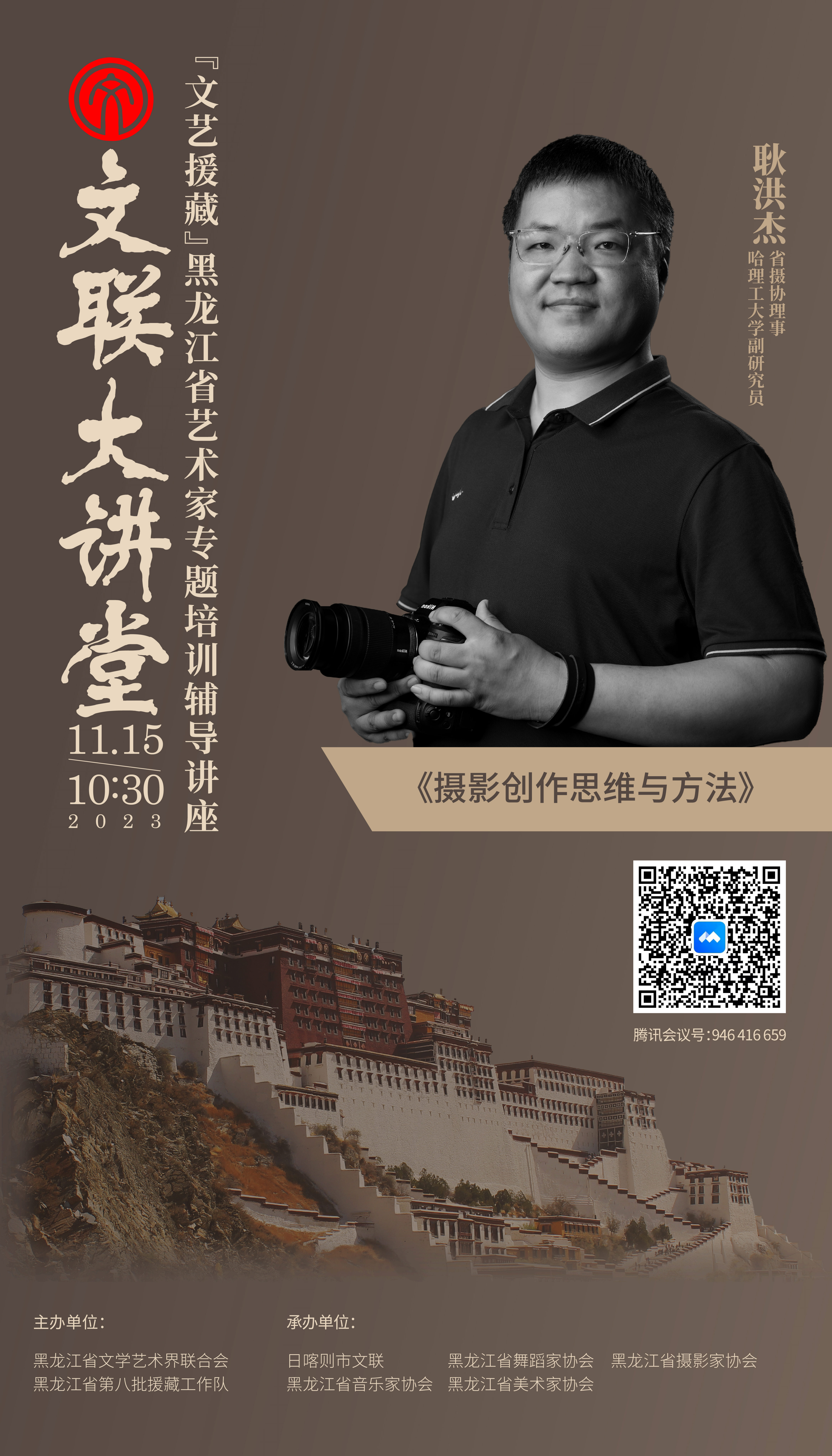 由黑龙江省文学艺术界联合会、黑龙江省第八批援藏工作队主办,日喀则市文联、黑龙江省音乐家协会、黑龙江省舞蹈家协会、黑龙江省美术家协会、黑龙江省摄影家协会承办的“文艺援藏”黑龙江省艺术家专题培训辅导讲座第五期《摄影创作思维与方法》将于11月15日10时30分在腾讯会议APP线上开讲。