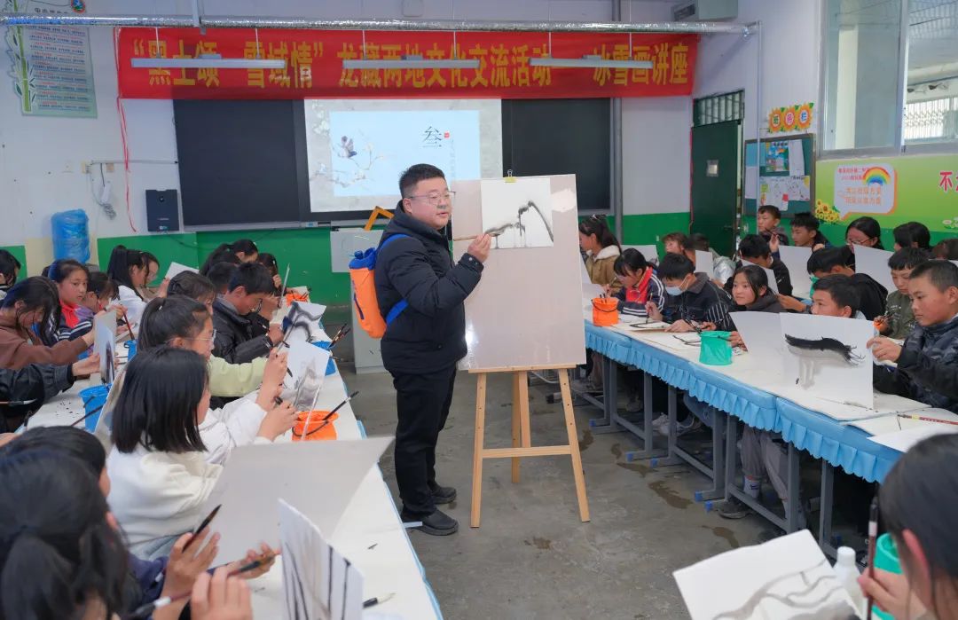 17日,中国民协理事、国家级非物质文化遗产项目“方正剪纸”艺术代表性传承人倪秀梅,黑龙江省美协理事、冰雪山水画技艺省级非遗传承人吴磊分别以《剪纸入门》《冷文化思潮衍生出的——冰雪画派》为题为日喀则市第二中学的学生们作辅导讲座,100余名学生参与学习,师生互动、气氛热烈。倪秀梅以理论讲解与手工实践相结合的方式进行教学,介绍了剪纸的概况、样式与种类,给学生示范剪石榴的技法一下子就引发孩子们对剪纸的强烈兴趣,师生合作剪出了一幅幅生动彩色的“小石榴”。吴磊从冰雪画的发展脉络、笔情墨意、冰雪画派的形成发展、冰雪文化的发展等几个方面向学生介绍了黑龙江特色传统文化冰雪画,又给学生现场演示怎样用毛笔、水墨颜料绘画表现冰和雪,并鼓励学生们大胆拿起画笔描绘心目中的冰雪世界。孩子们在老师的耐心指导下,剪出人生第一幅剪纸作品,创作出人生第一幅水墨国画。课程结束后孩子们意犹未尽,恋恋不舍,“真希望黑龙江的艺术家们能够再来给我们上艺术课!”2位艺术家为学生赠送作品、签字合影,传递技艺、结下友谊,并与学生约定会在网上继续为孩子们授课。