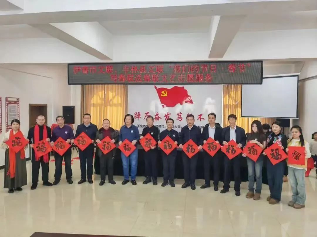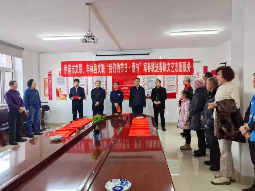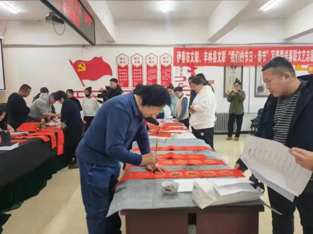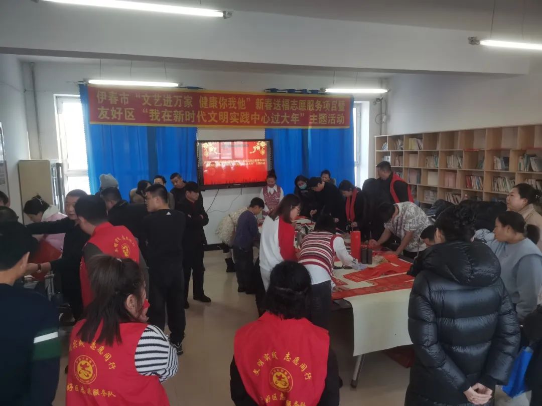 1月9日起,伊春市文联组织开展“我们的节日·春节”写春联送春联系列文艺志愿服务活动,文艺志愿者先后走进丰林县三个镇、友好区双子河社区、伊美区新时代文明实践中心和朝阳街道办事处、残联、交警支队、公交公司、溪水林场分公司,现场挥毫泼墨,为群众书写承载美好祝福的春联2000余副、福字2500多个。