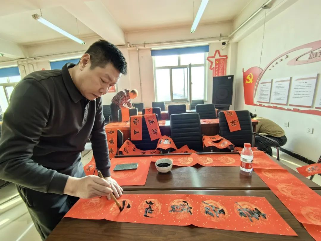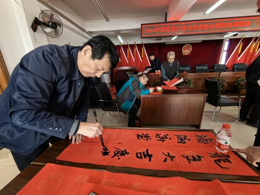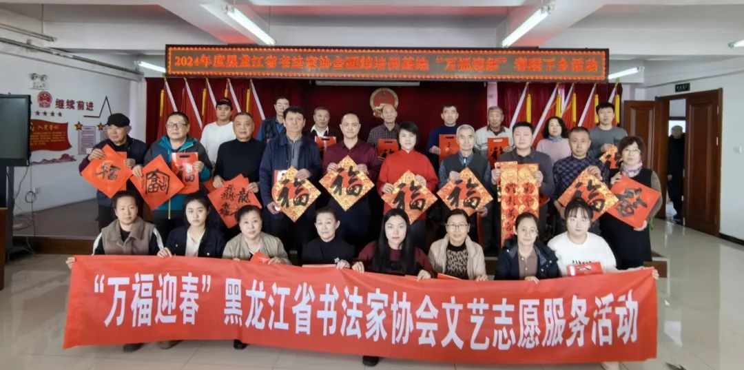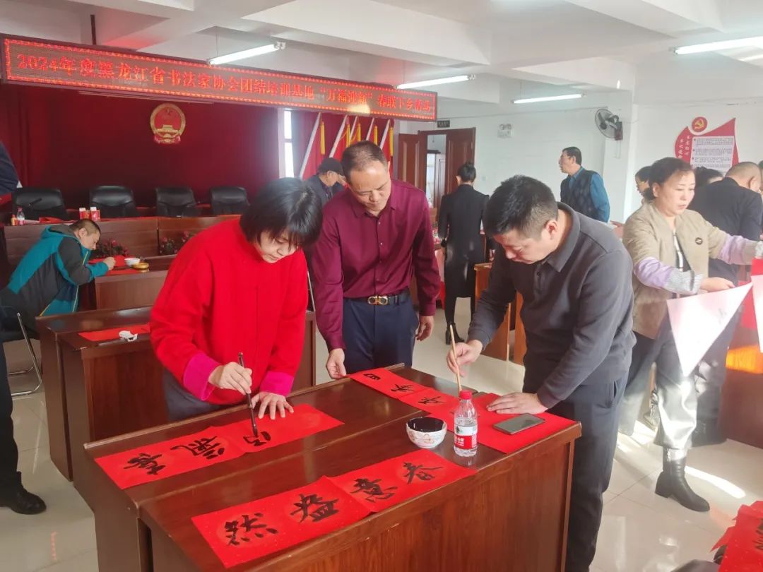 笔墨馨香迎新岁,金龙腾飞展宏图。2月1日,由黑龙江省书法家协会主办,哈尔滨市道外区团结镇人民政府、团结镇农民书法创作基地承办的“万福迎春”文艺志愿服务活动在团结镇人民政府举办。省书协驻会副主席兼秘书长秦宏,副主席陈宇龙、宋卫东,理事闫恩双现场书写春联、福字,为团结镇居民及书法爱好者送上新春的美好祝愿。
