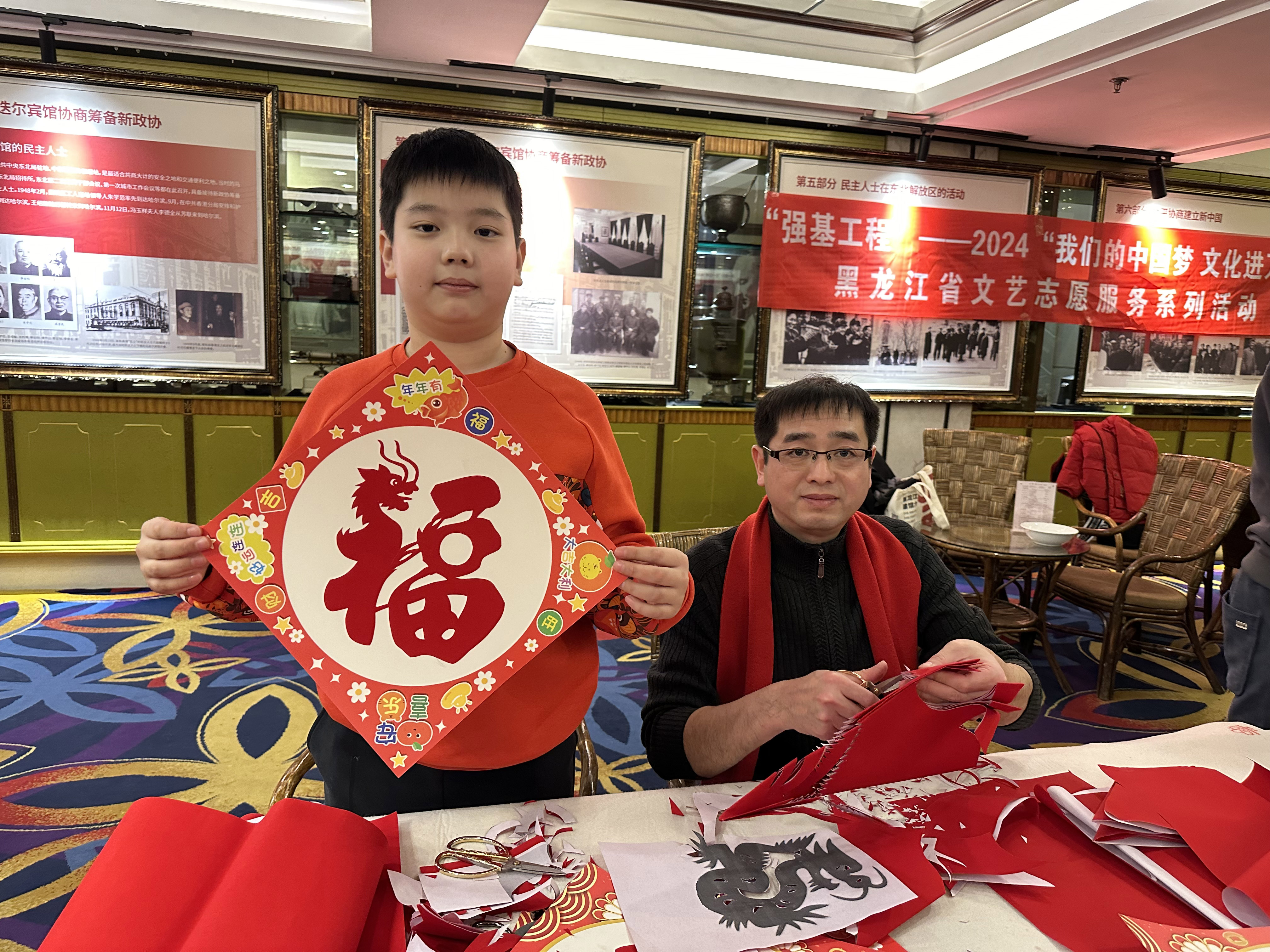 2月2日,书法家秦宏、石正军、许凯军、王显君、周亮、闫恩双、高少珂,版画艺术家艾天淇、李军岩,民间文艺家葛涛、葛政豪,摄影家侯庆滨、朱敬业等10余位黑龙江文艺志愿者,在马迭尔宾馆一楼大堂一字排开支起了创作台、铺好了笔墨纸砚,以对联书写、春联赠送、窗花剪裁、版画拓印体验等形式,与广大市民和游客亲密互动。