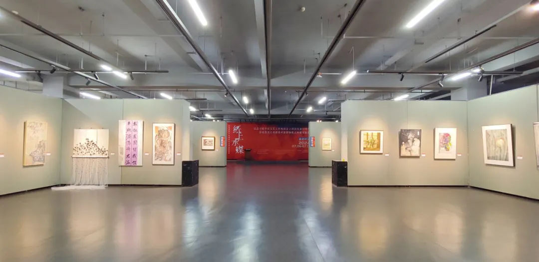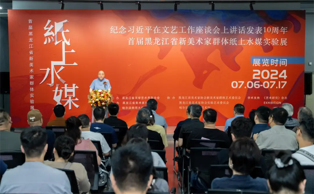 7月6日上午,由黑龙江省文学艺术界联合会主办,黑龙江省美术家协会、哈尔滨师范大学美术学院承办,黑龙江省美术家协会新美术家群体艺术委员会、黑龙江省美术家协会实验艺术委员会、哈尔滨师范大学美术馆协办的“纪念习近平总书记文艺工作座谈会重要讲话10周年·首届黑龙江省新美术家群体纸上水媒实验展”在哈尔滨师范大学美术馆开幕。