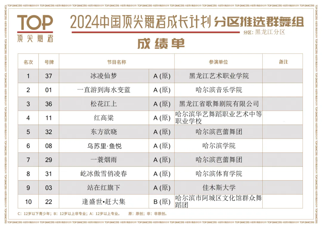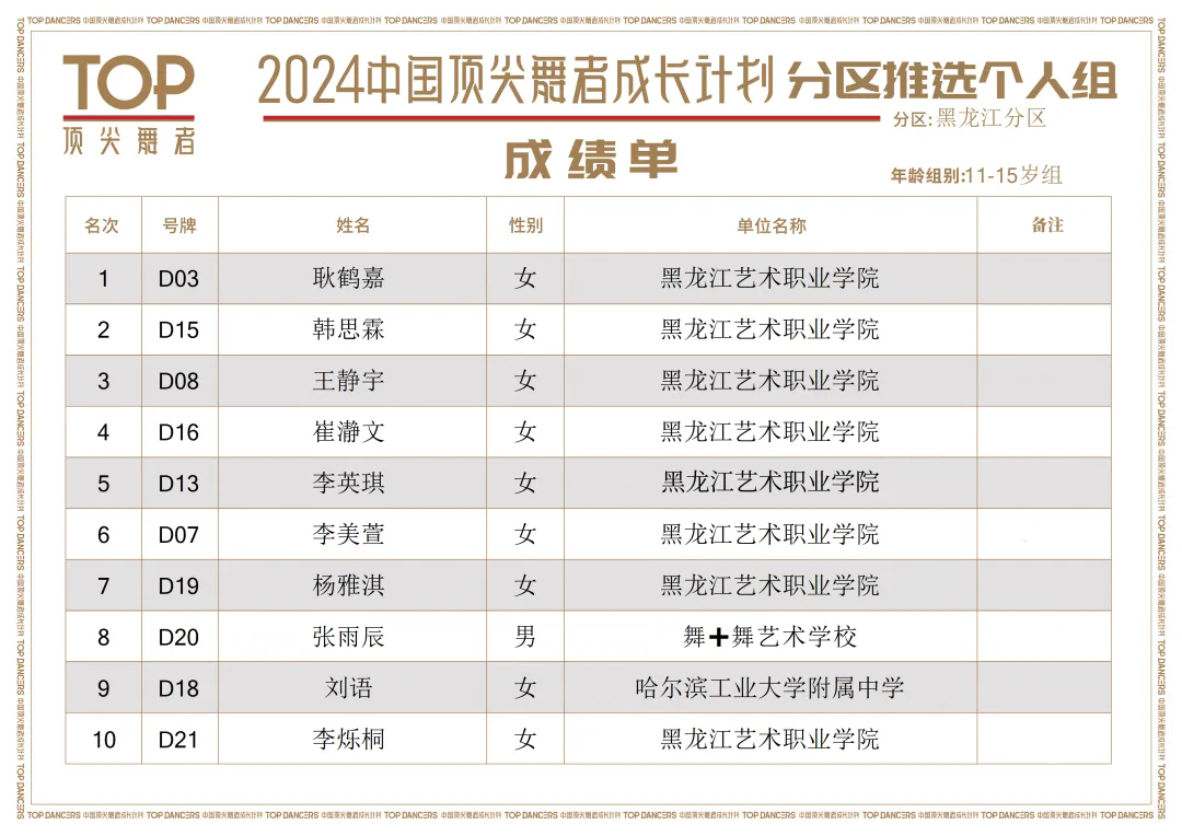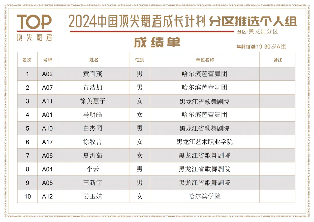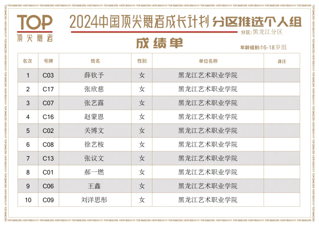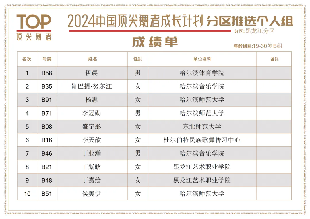 由中国舞蹈家协会主办的“2024中国顶尖舞者成长计划”黑龙江分区推选活动经现场评审打分,个人组、群舞组十强名单于近日公布。