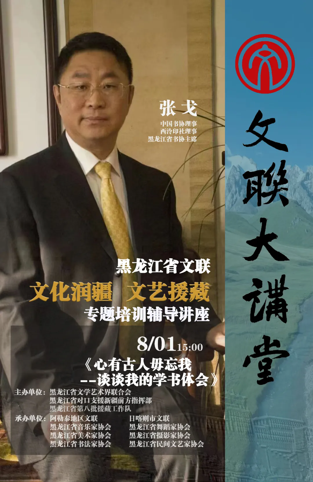 由黑龙江省文学艺术界联合会、黑龙江省对口支援新疆前方指挥部、黑龙江省第八批援藏工作队主办,阿勒泰地区文联、日喀则市文联、黑龙江省音乐家协会、黑龙江省舞蹈家协会、黑龙江省美术家协会、黑龙江省摄影家协会、黑龙江省书法家协会、黑龙江省民间文艺家协会承办的黑龙江省文联“文化润疆 文艺援藏”专题培训辅导讲座第六期《心有古人毋忘我一一谈谈我的学书体会》将于8月1日15时在腾讯会议APP线上开讲。