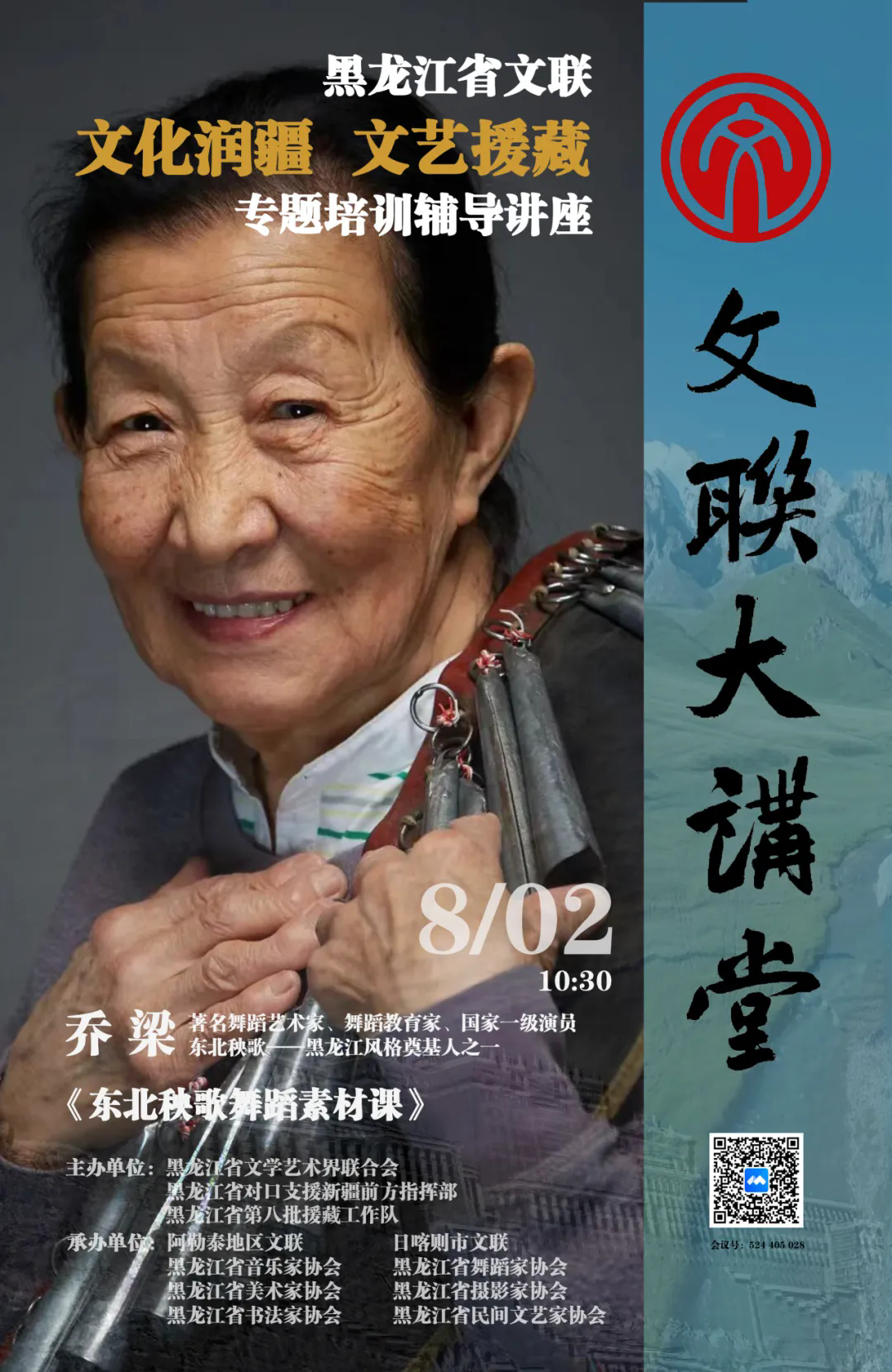 由黑龙江省文学艺术界联合会、黑龙江省对口支援新疆前方指挥部、黑龙江省第八批援藏工作队主办,阿勒泰地区文联、日喀则市文联、黑龙江省音乐家协会、黑龙江省舞蹈家协会、黑龙江省美术家协会、黑龙江省摄影家协会、黑龙江省书法家协会、黑龙江省民间文艺家协会承办的黑龙江省文联“文化润疆 文艺援藏”专题培训辅导讲座第七期《东北秧歌舞蹈素材课》将于8月2日10时30分在腾讯会议APP线上开讲。