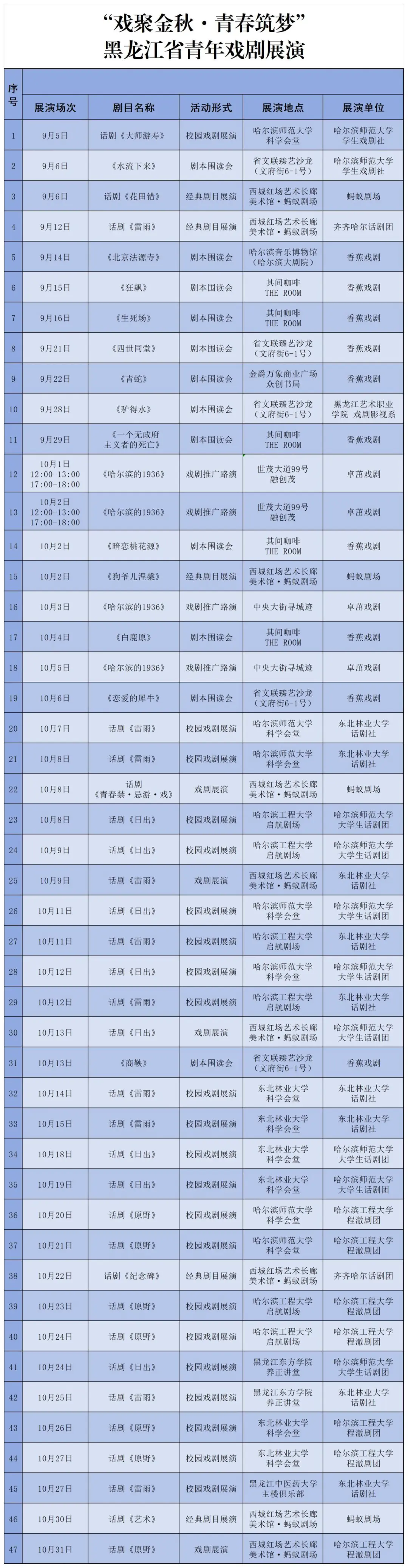 由黑龙江省文化和旅游厅主办、黑龙江省文学艺术界联合会支持、黑龙江省戏剧家协会承办的 “戏聚金秋•青春筑梦”黑龙江省青年戏剧展演,将于9月-10月在哈尔滨市举行。此次展演汇集10部剧目、40场演出、12场剧本围读会,囊括多部经典与原创话剧的演出,集经典与创新于一体,聚传统与现代于一堂。校园戏剧展演和剧本围读会均扫码预约免费赠票,戏剧展演、经典剧目展演和戏剧推广路演,部分座席免费,扫码预约,赠完为止。首场展演——话剧《大师游寿》9月5日在哈尔滨师范大学科学会堂上演。