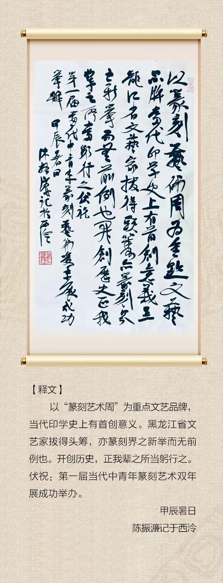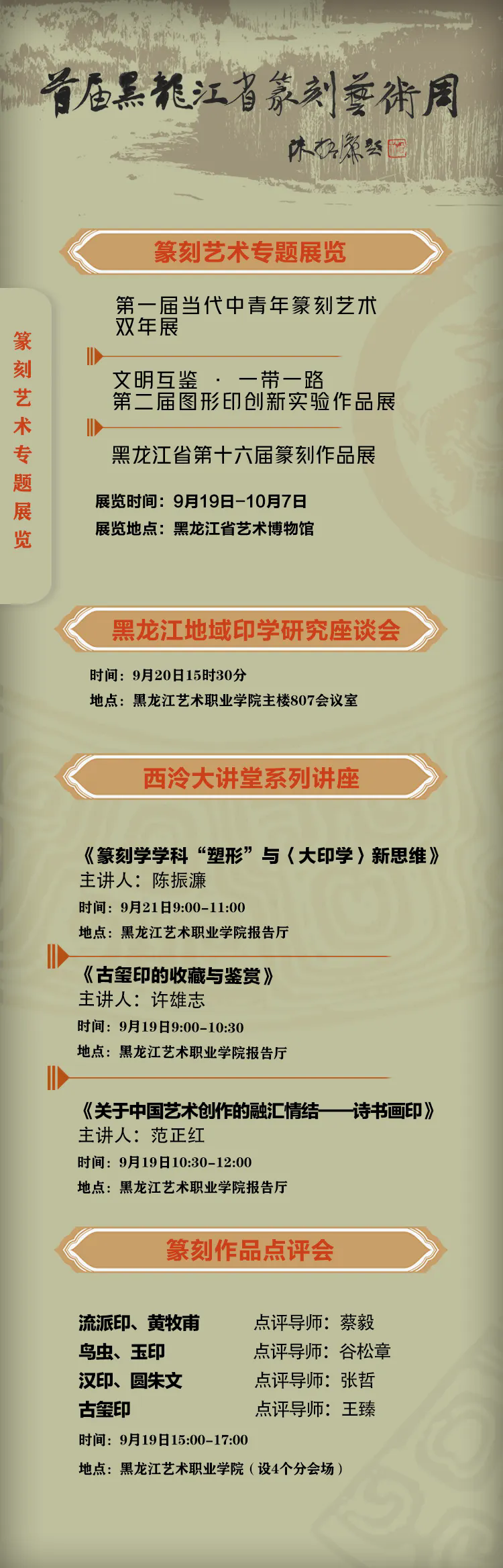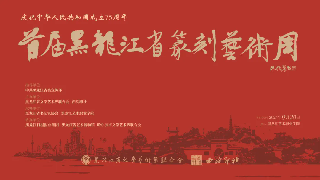 首届黑龙江省篆刻艺术周由中共黑龙江省委宣传部指导,黑龙江省文学艺术界联合会、西泠印社主办,黑龙江省书法家协会、黑龙江艺术职业学院承办。9月17日起这一颇具首创性的艺术篇章将在龙江大地上徐徐展开。艺术周期间将组织开展专题展览、高端论坛、讲座研讨、雅集笔会、访学调研等精彩纷呈的系列活动,为国内外金石研究者、篆刻艺术家和广大书法篆刻爱好者及广大市民、游客呈现一场精妙绝伦的文化艺术盛宴。