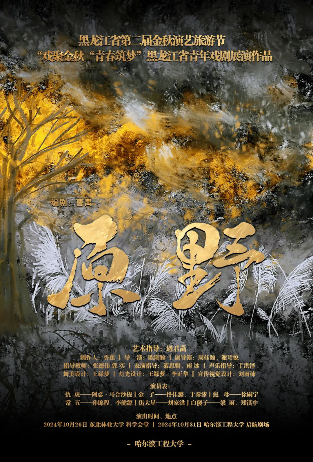 由黑龙江省文化和旅游厅主办、黑龙江省文学艺术界联合会支持、黑龙江省戏剧家协会承办的 “戏聚金秋•青春筑梦”黑龙江省青年戏剧展演,于9月-10月在哈尔滨市举行。校园戏剧展演均扫码预约免费赠票,戏剧展演部分座席免费,扫码预约,赠完为止。
