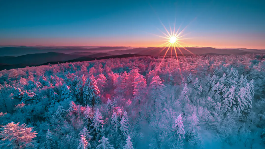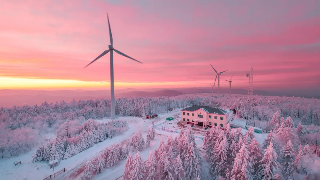 傍晚时分,大箐山出现绚丽的晚霞,我们爬到十几米高的防火塔上俯拍。放眼望去,云已被渲染成红色、粉色、蓝色、紫色,挂满雪凇、雾凇的树缝间透出粉红色的光,有的还被镶上蓝边或黄边,屋顶、风力发电的风车都被暖光簇拥着,美得让人窒息。我们激动得心脏都快要跳出喉咙。