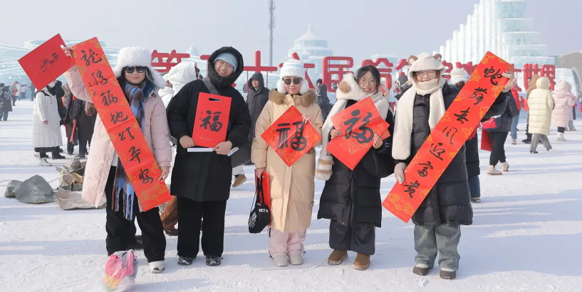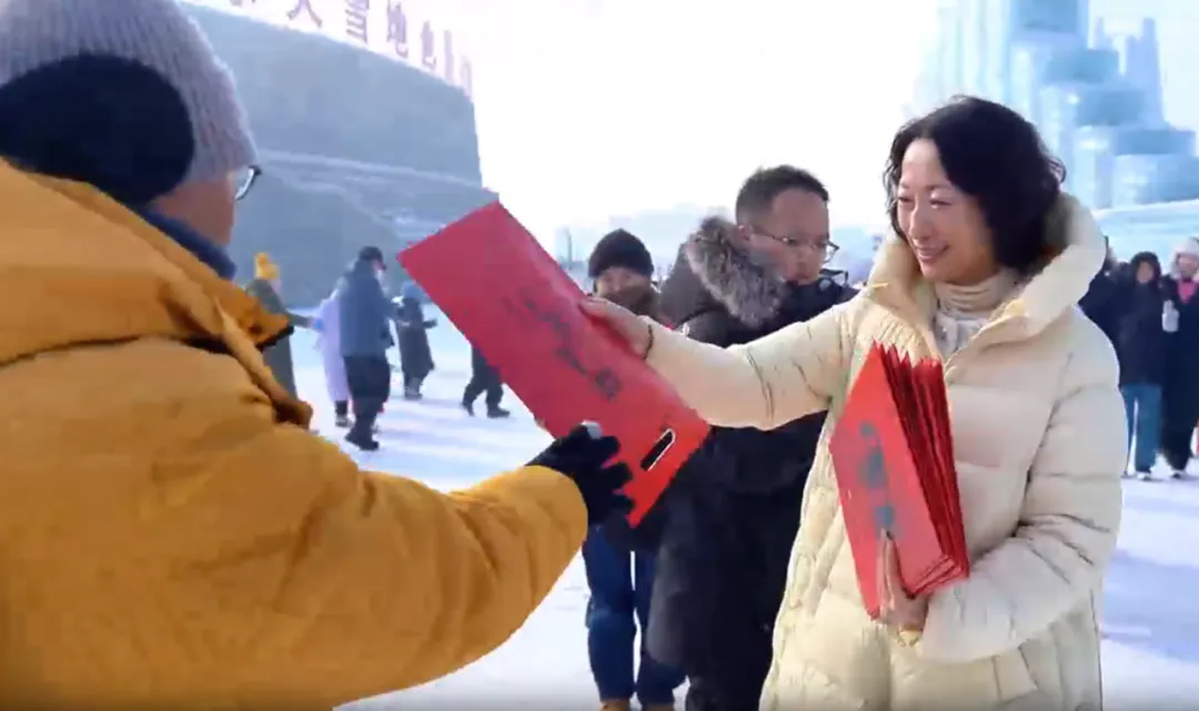 此次活动作为我省“万福迎春”系列公益活动之一,书法家们还现场书写春联、“福”字500余副。笔会结束后,领导与书法家们手持春联、“福”字,来到冰雪大世界园区中,向游客送祝福、送吉祥。游客纷纷围拢在书法家们身边领取作品,期待着为新春的家门添一抹亮色。领到春联的广州游客张女士开心地说:“今天真是太幸运了,没想到在欣赏冰雪美景的同时,还能领到书法家们亲手书写的春联,我要将尔滨的这份祝福带回家。”