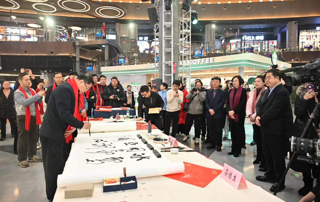 笔会现场翰墨飘香,丝竹和鸣,气氛热烈。书法家们以精湛娴熟的笔法,共同开启了一场精彩纷呈的文化盛宴。他们挥毫泼墨、笔走游龙,一幅幅精彩的书法作品、一句句寓意吉祥的春联、一张张形态各异的“福”字跃然纸上。这些书法作品真草隶篆各体兼备、异彩纷呈,有的端正严谨、工整细腻,有的苍劲有力、大气豪迈,极具观赏性,吸引了众多游客、书法爱好者驻足观看。