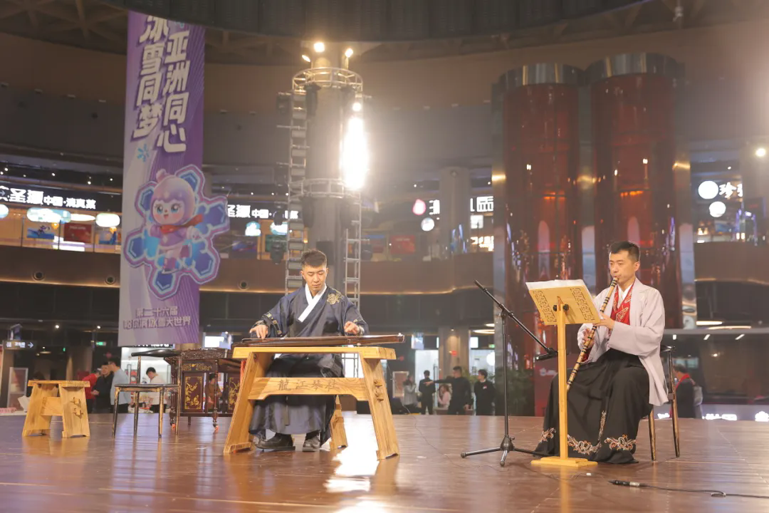 在书法笔会如火如荼进行的同时,来自省歌舞剧院、黑龙江艺术职业学院、省文联“文艺两新”文艺志愿服务团的艺术家们为现场观众献上了一场精彩纷呈的文艺演出。民乐合奏《金蛇狂舞》《步步高》等节目旋律激昂、节奏明快,古筝演奏《梅花三弄》《尔滨的雪》等节目曲声悠扬、意境深远,歌曲演唱《我爱你中国》《我和我的祖国》等节目情感真挚、感人至深,也让观众有机会近距离欣赏和了解中国传统文化的美妙意境。本场活动巧妙地将书法艺术与文艺演出相结合,让平面艺术与舞台艺术交相辉映,充分展现出中华优秀传统文化的生机与活力,生动体现出龙江文艺工作者的风采和实力,同时也为迎接亚冬会增添了浓郁的文化气氛。