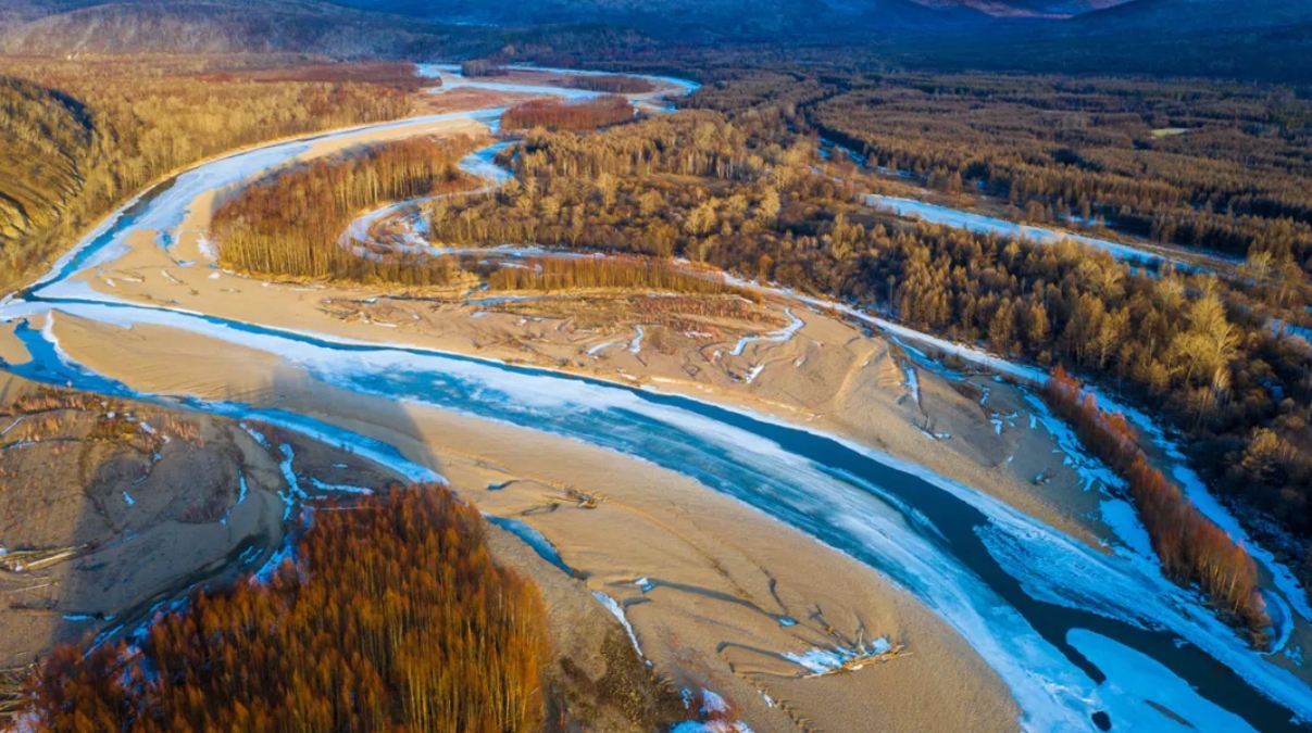 拍摄开阔场景——将冰河的走向、河岸边的红柳的分布情况组合,可以真实自然地展现壮美的冰河红柳美景。机位可选在河岸的高处、山坡上,而无人机升空后则能更灵活地拍摄。